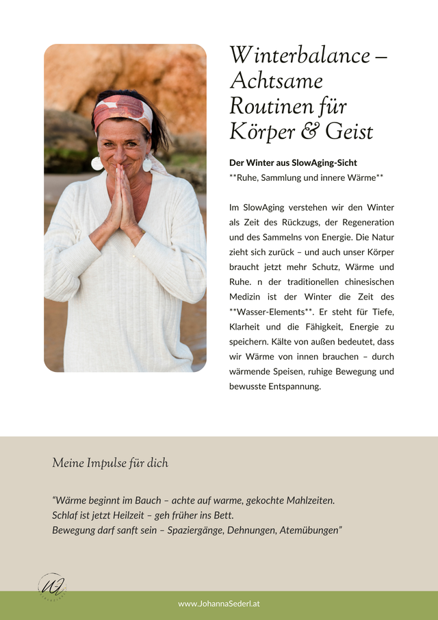 Der Winter steht für Regeneration, Tiefe und bewusste Fürsorge für Körper, Haut und Geist. Mit dem Slow Aging Winter-Workbook erhältst du den beliebten Onlinekurs von Johanna Sederl erstmals als hochwertigen Begleiter auf Papier. Auf über 100 Seiten findest du fundiertes Slow-Aging-Wissen, alltagstauglich und ganzheitlich aufbereitet, ergänzt durch Impulse zur Selbstreflexion, Rezepte und Ernährungsideen für die kalte Jahreszeit sowie praktische Anregungen zu Hautpflege, Säure-Basen-Balance und Zellgesundheit. Mit Platz für Notizen und persönliche Routinen eignet sich das Workbook ideal zum Begleiten, Vertiefen oder eigenständigen Durcharbeiten – für alle, die Slow Aging bewusst und nachhaltig leben möchten.